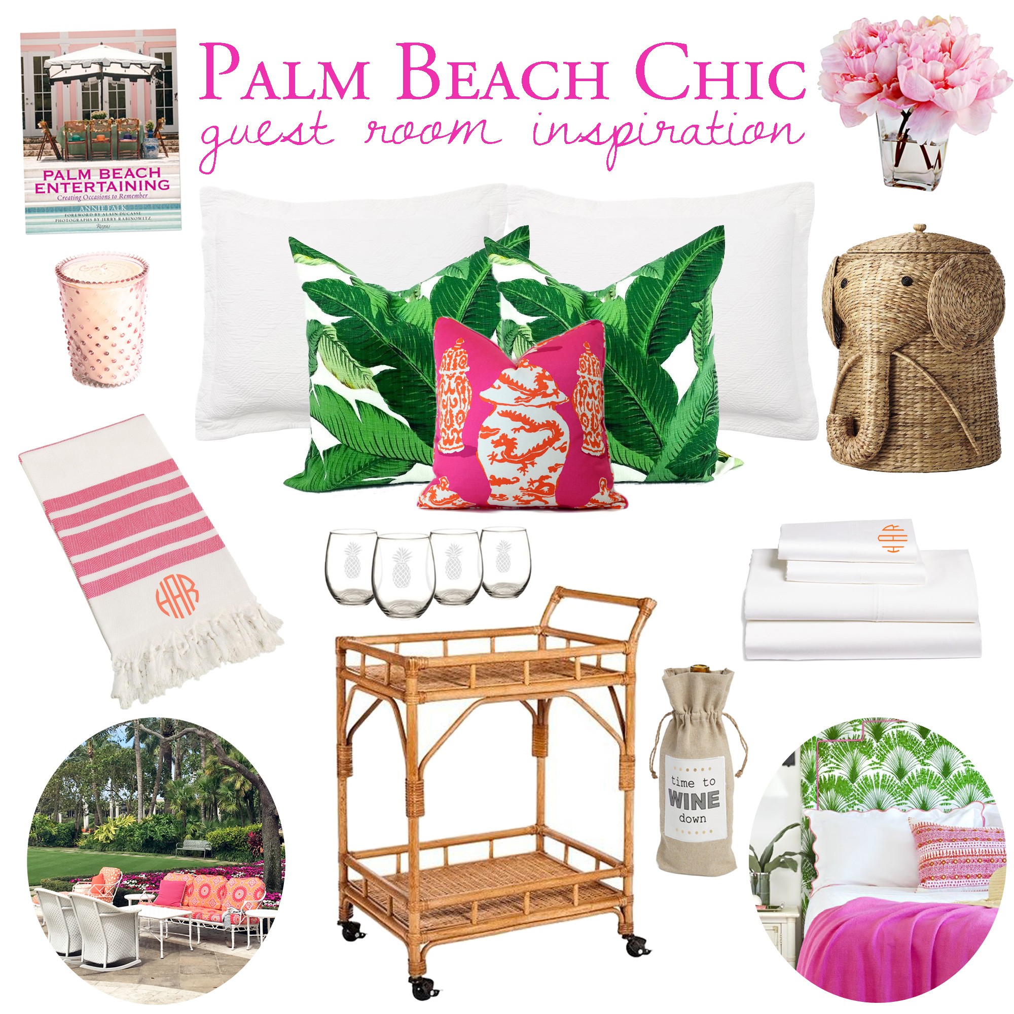 It has been so much fun to have a completely blank slate to work with in our guest room. Right now we just have a queen bed with a white quilt and a few random pieces of furniture that may stay or may go! Most of our decor through the house is different shades of blue with white so I am so ready to add some more color, especially in some of my favorite colors! Its probably no surprise love the "Palm Beach Chic" style because of the great colors and mix of old and new. See more Palm Beach style from THIS POST back in March!