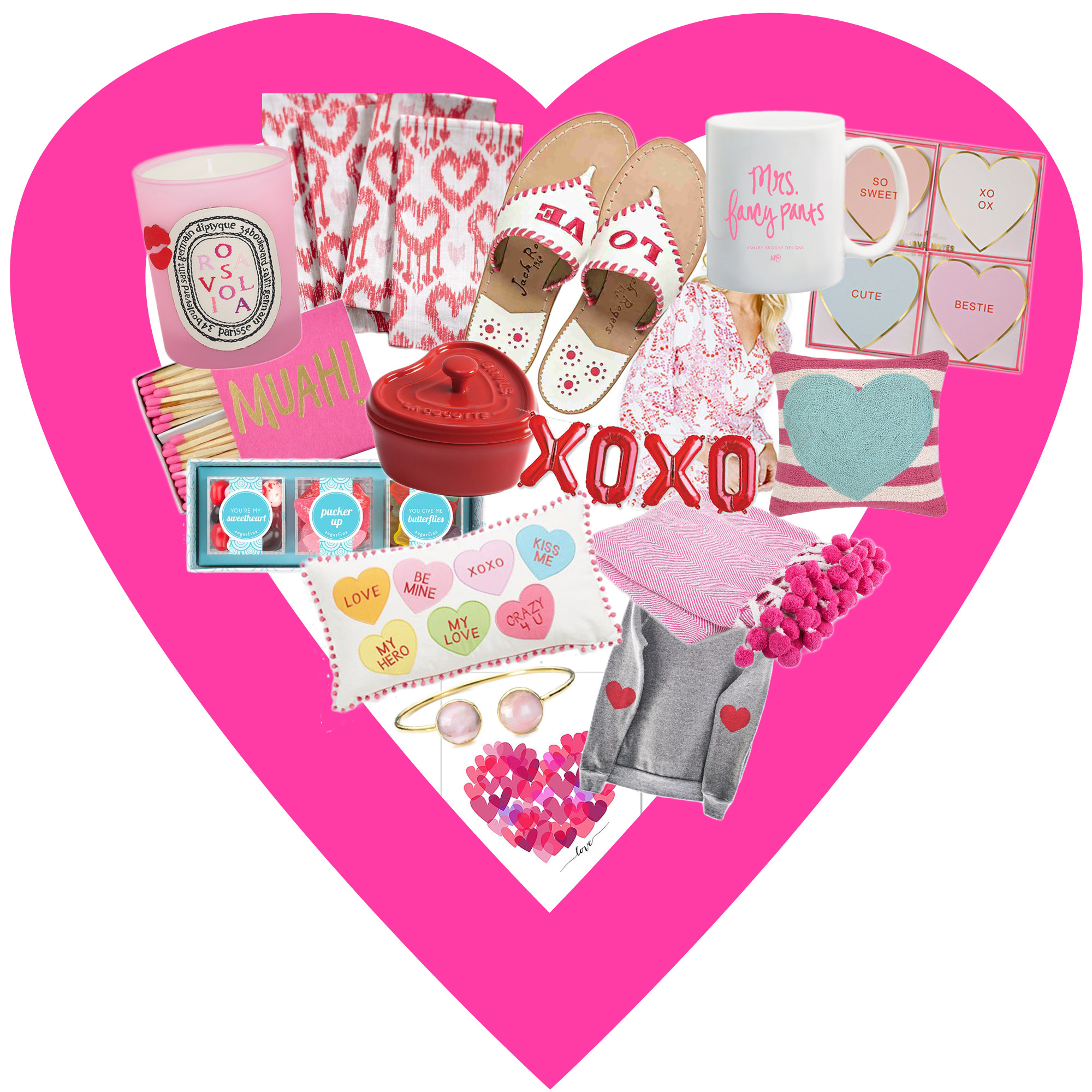 "Rosaviola" candle // heart ikat napkins // LO-VE sandals // Mrs. Fancy Pants mug // candy heart cards